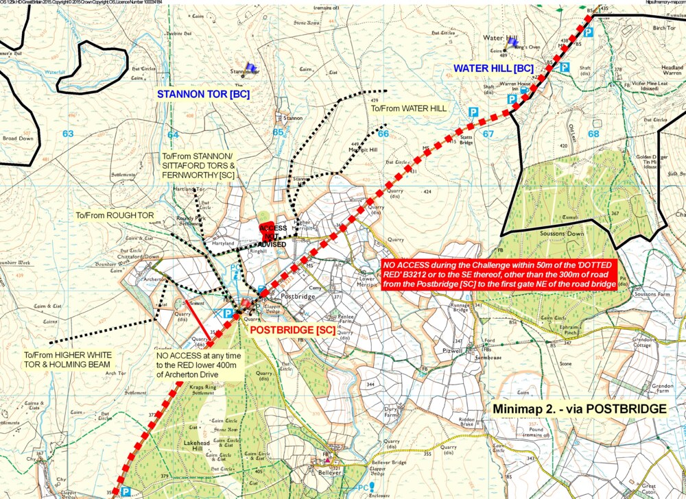 - Postbridge – please note that the only permitted use of the B3212 is between the Postbridge [SC] and the gate immediately to the NE of the road bridge; the B3212 to the NNE and the WSW of the permitted section is OOB. The recommended lines to and from all of the adjacent controls make use of the gates, stiles and permitted accesses.