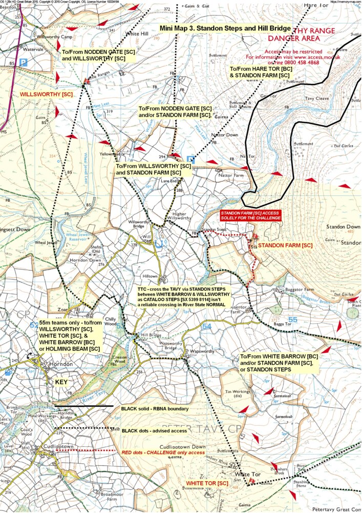 - Standon Steps/Standon Farm + Wheal Jewel/White Tor. Following repairs, the Standon Steps [FB] footbridge should only be crossed by a single team at a time; to protect the bridge, avoid walking in step. As Standon Farm is Out of Bounds [OOB] during training, the black dashed training access to and from the Standon FB is to be used instead. The red-dotted access to and from Standon Farm [SC] is SOLELY for use during the Challenge. For White Barrow [BC] / Willsworthy [SC] direct, cross the Tavy at Standon Steps as the stones at Cataloo Steps [SX 5399 8114] are too low lying to be relied upon.