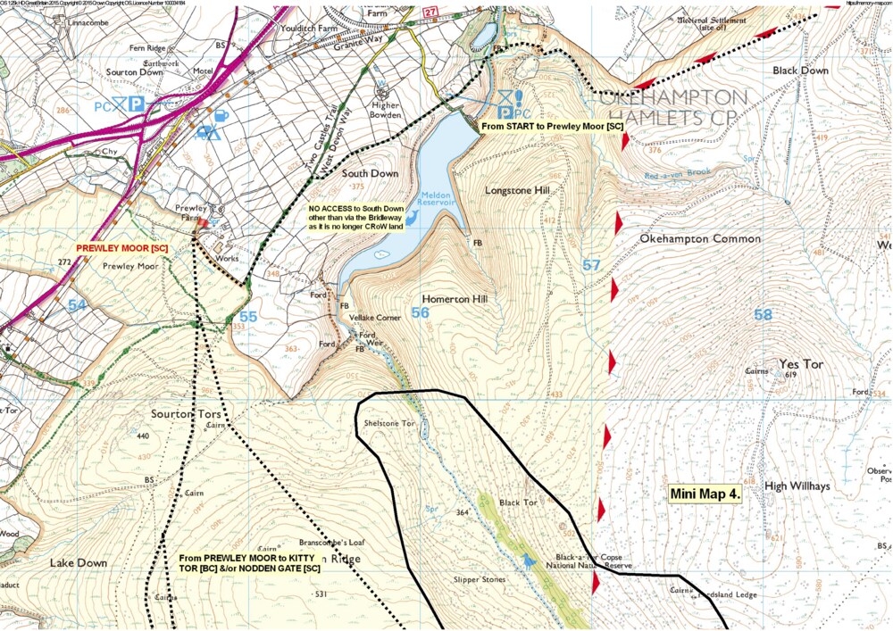 - Start - Prewley Moor/ Kitty Tor – avoiding the worst of the gorse to the E of Meldon Dam and highlighting the alternative Prewley Moor/Kitty Tor options.